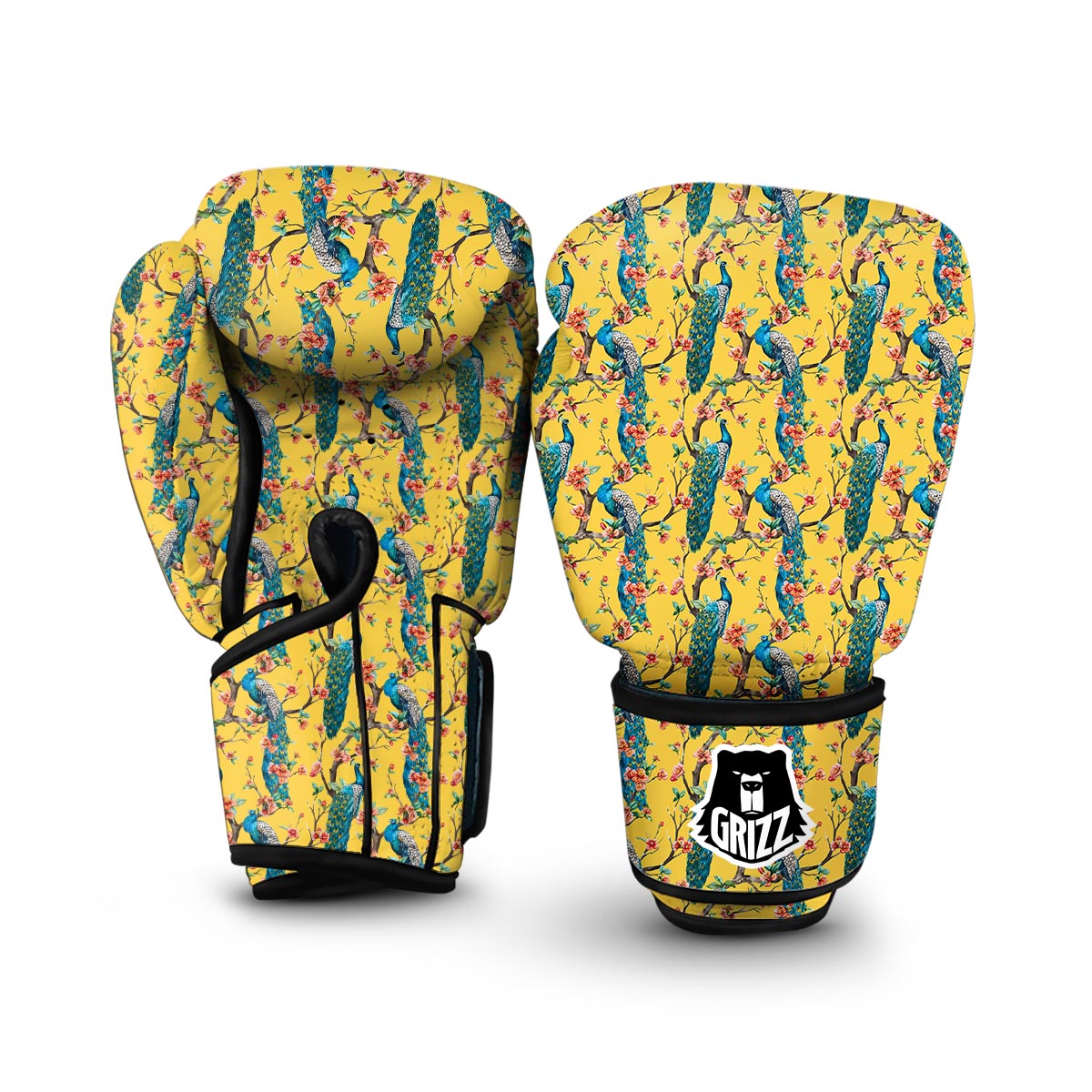 Yellow Peacock Floral Pattern Print Boxing Gloves