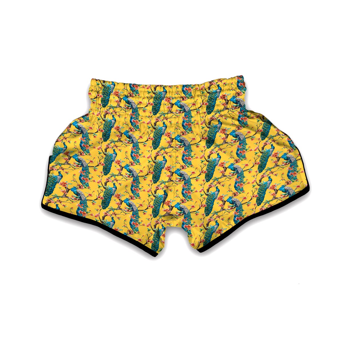Yellow Peacock Floral Pattern Print Muay Thai Boxing Shorts