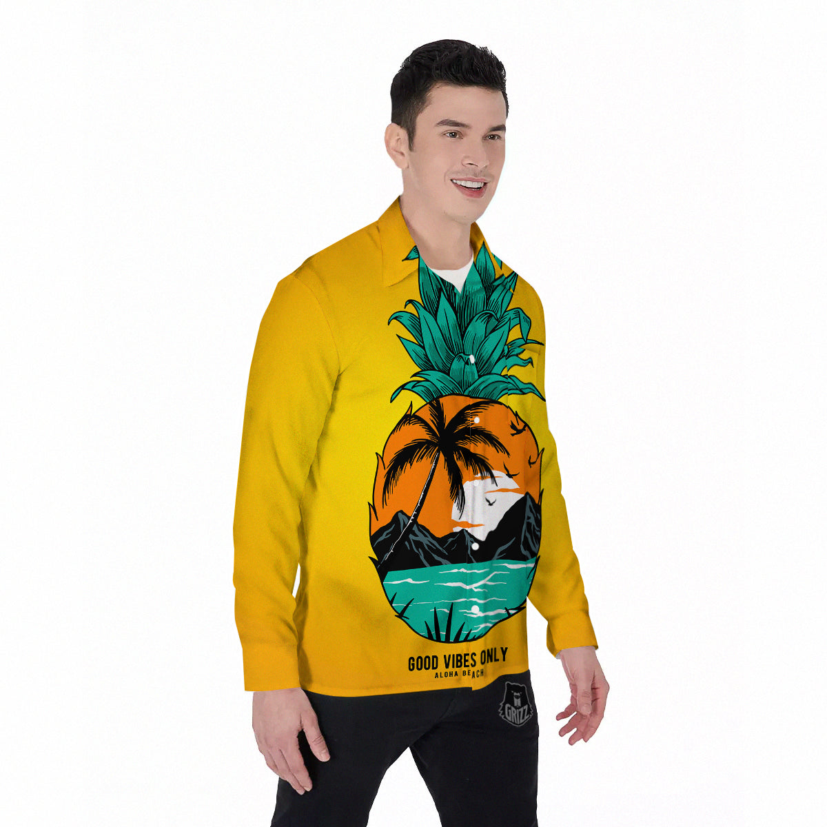 Yellow Pineapple Aloha Tropical Island Print Men's Long Sleeve Shirts