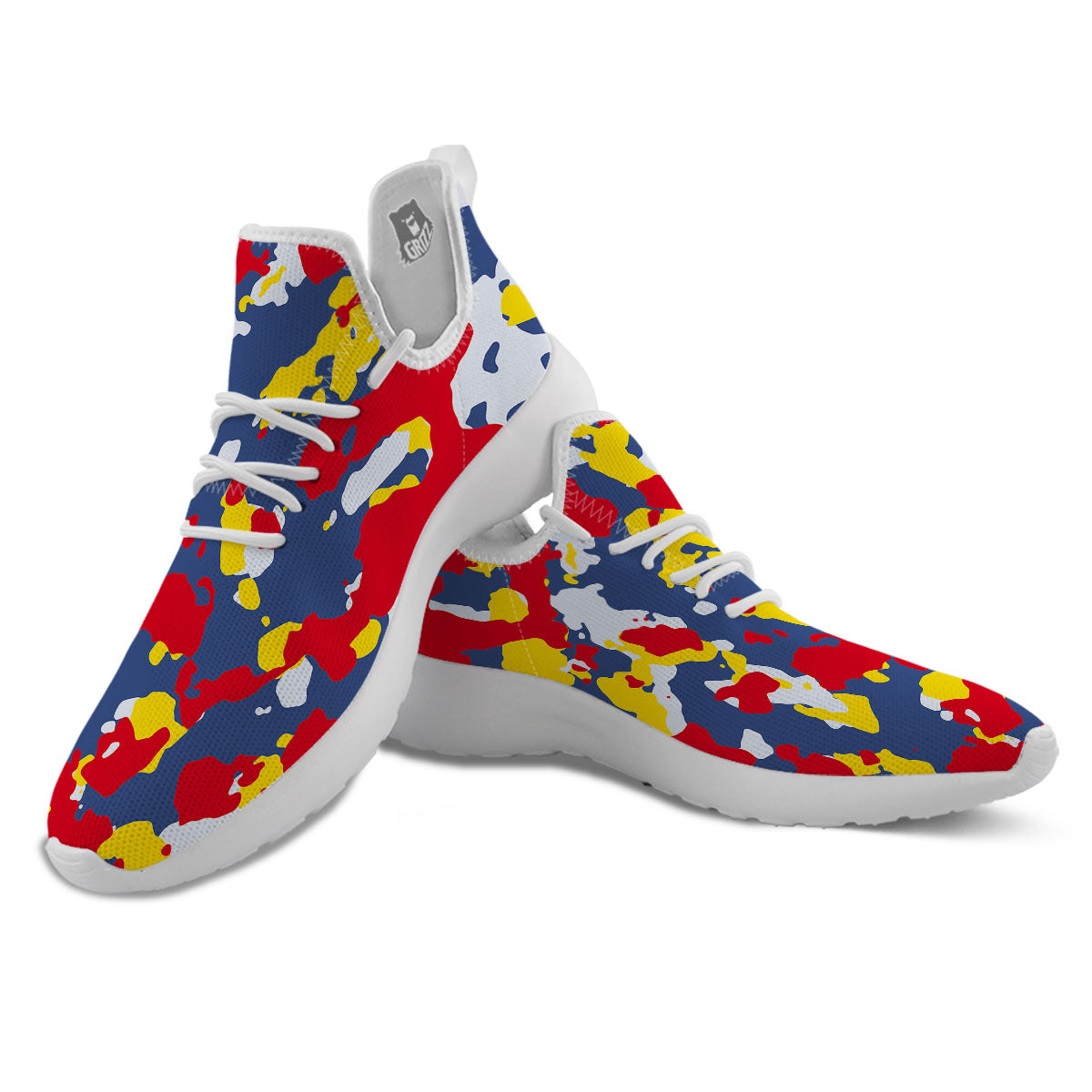 Yellow Red And Blue Camouflage Print White Athletic Shoes