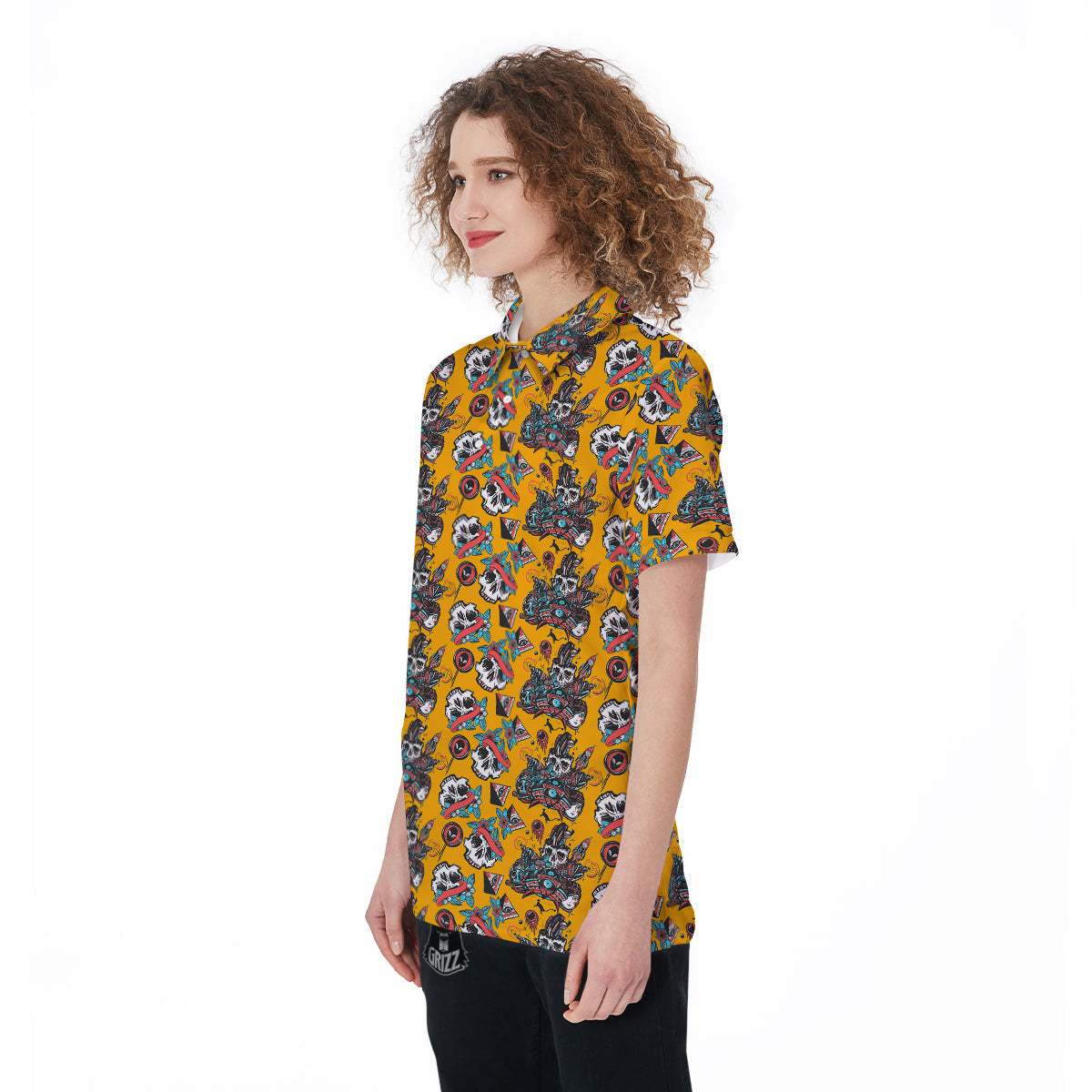 Yellow Skull Old School Tattoo Print Pattern Women's Golf Shirts