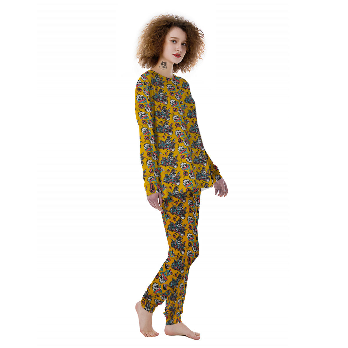 Yellow Skull Old School Tattoo Print Pattern Women's Pajamas