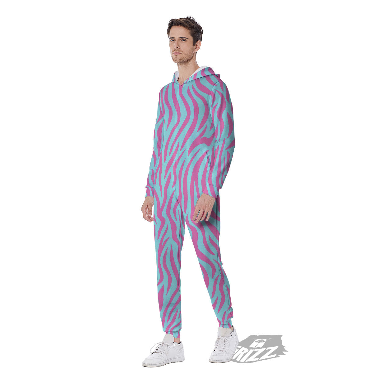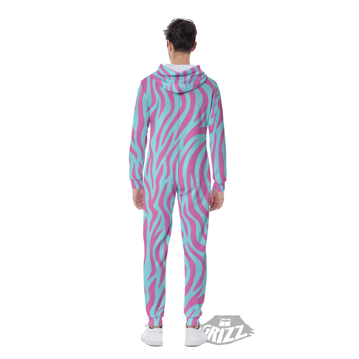 Zebra Stripes Blue And Pink Print Men's Jumpsuit