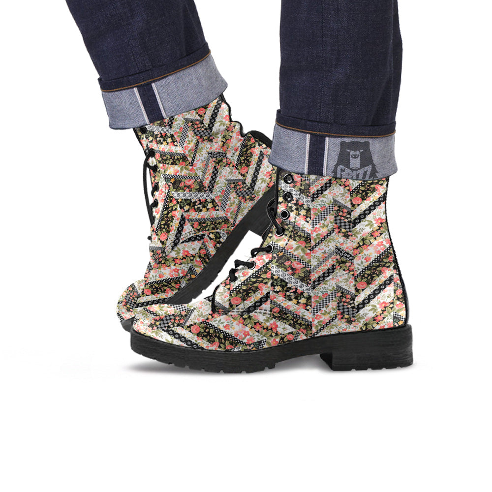 Zigzag Floral Patchwork Print Pattern Leather Boots