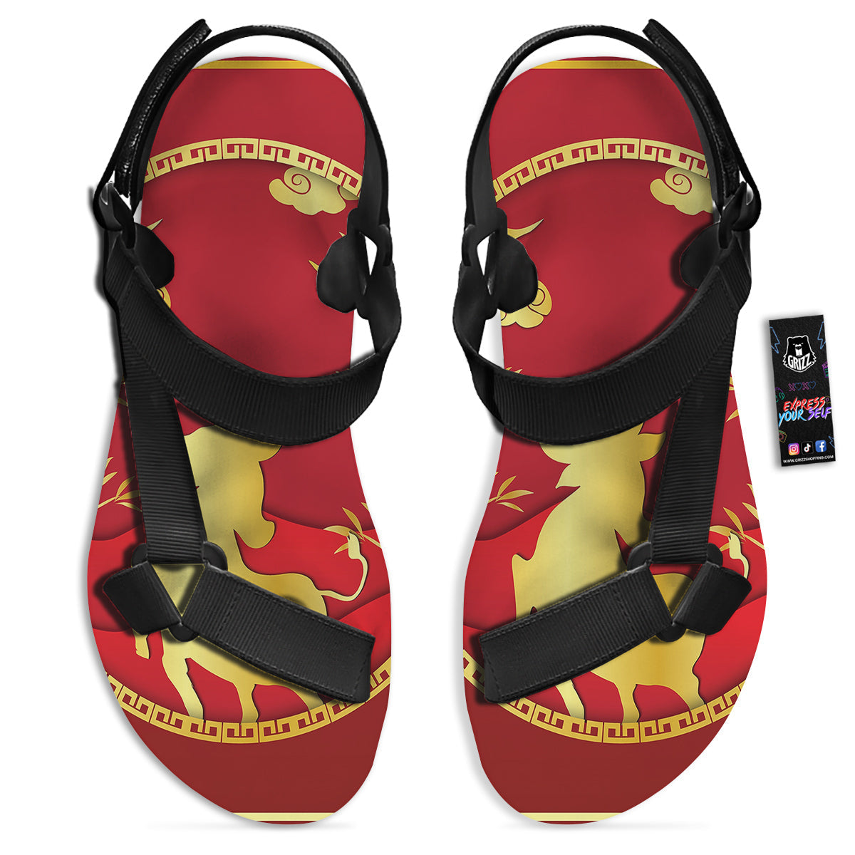 Zodiac Symbol Chinese Ox Print Black Open Toe Sandals